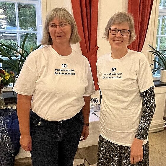 Die herzlichsten Glückwünsche zur neuen Leitungsaufgabe wurden im Grußwort verknüpft mit den Stärken weiblicher Vorbilder aus der Bibel, die Inke Thomsen-Krüger in ihrer neuen Aufgabe stärken und begleiten sollen. Außerdem wurde ihr ein T-Shirt mit den "10 guten Gründen für ev. Frauenarbeit" überreicht (siehe Foto).
