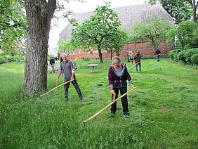 Ob Blühwiese oder Streuobstwiese: wer ökologisch wertvolle, artenreiche Lebensräume erhalten und entwickeln will, sollte auch die Pflege bedenken, denn ohne Mahd geht es nicht. Gerade der Einsatz des richtigen Mähgeräts entscheidet zudem darüber, wie viele Lebewesen während des Pflegegangs dem Schneidewerkzeug zum Opfer fallen. Wer Rohstoffe sparen und die Natur und Umwelt schonen will, sollte auf den Mähbalken verzichten und zur Sense greifen. Mit passendem, auf den Körper eingestelltem Werkzeug und der richtigen Mähtechnik, braucht es nur wenig Kraft. So kann die Wiesenmahd zum unvergleichlichen Naturerlebnis werden. Entspannt, ohne Lärm und Abgase, umgeben vom Duft der Gräser und Kräuter. Lernen sie in einem Tageskurs mit dem erfahrenen Sensenlehrer Hartmut Winkels (Sensenverein Deutschland) den Umgang mit der Sense, der die Pflege des Geräts einschließlich des Dengelns umfasst. Nur mit einer gut gedengelten Sense geht die Arbeit leicht von der Hand! Falls vorhanden, kann die eigene Sense mitgebracht werden, Sensen werden sonst gestellt. Hierzu ist bei der Anmeldung die Angabe der Körpergröße erforderlich!